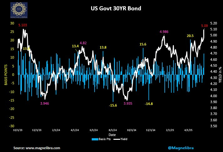 So when we look at the present rates of long term interest, we actually think this is where the long rate should be, its basically at equilibrium toward perceived longer term risk premium. In fact when we look at the US Govt 30y chart we can see this same level 5.09/5.11% was the high back in Oct. of 2023 and we collapsed from there. Its actually very interesting the narrative now given the fact that longer term rates are exactly where they were a year and a half ago!