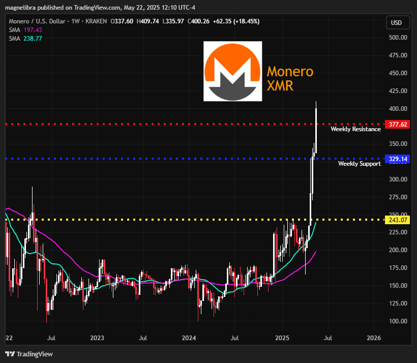 As far as Monero, the top privacy coin, by which we feel will provide the necessary function of private transactions for the digital future has seen some very chunky real buying the last 2 days. Monero blew past our $377 weekly resistance trading above $400 now and +18.45% on the week: