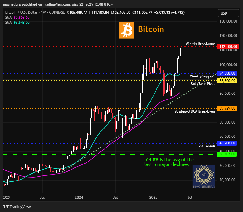Bitcoin is nearing our weekly resistance level at $112.5k and will see if it can hold near there into the weekends close or if it sees some profit taking, but overall Bitcoin is +4.73% on the week: