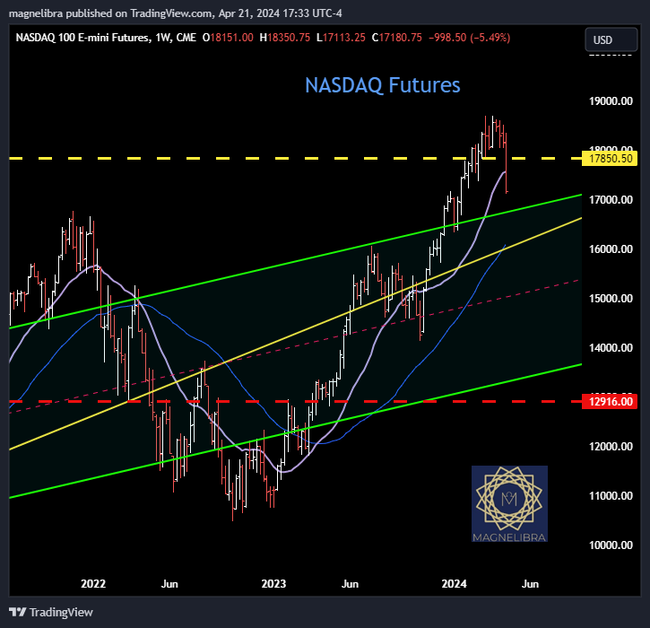 As we led onto last Sunday in our podcast, the major top formation that has been transpiring and working itself out over the last 2 months has now been confirmed. The Nasdaq futures level that we targeted was the 17850 level and we have watched this for a long time now and the week had a very decisive close below this level. Take a look at the massive selloff below this area as the Nasdaq futures closed the week out at 17180.75 -998.50 points or -5.49% on the week: