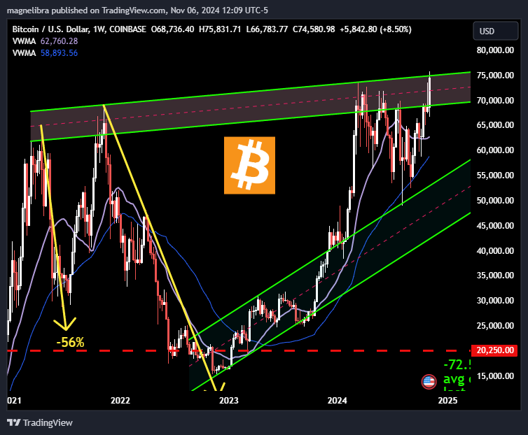 Bitcoin pushed to new ATHs but continues to trade around the upper band range that we have highlighted for quite some time, currently $74.5k +8.5% on the week: