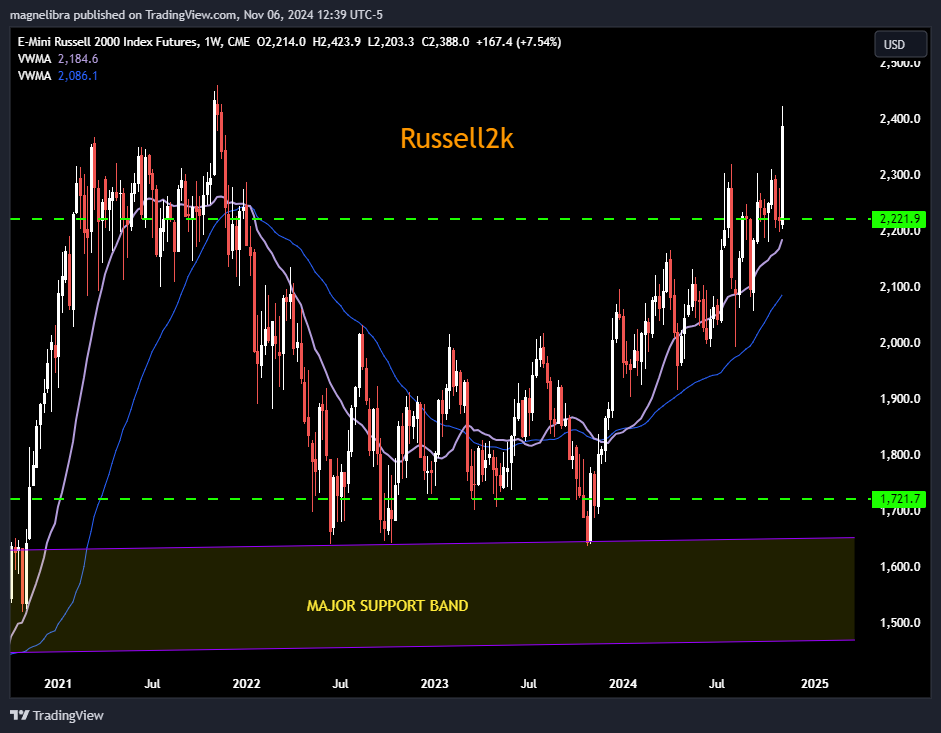 That pretty much sums it up. Alright so it looks as if the Republicans have the Presidency, the Senate and most likely the House and honestly there will be no excuses not to succeed here. The markets seem to have loved the outcome as equities are much higher up over 2% plus with the R2k futures leading the way up 5% on the day and 7.5% this week so far, massive move indeed: