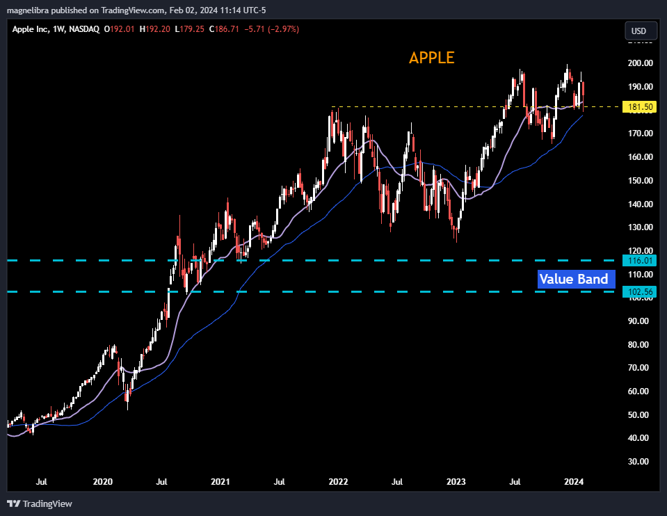 Next up Apple, where we know the decreased China sales would be the dent in the armor but Apples numbers weren’t that bad and they avoided a 5th straight quarterly loss, however forward guidance was not great and were not sure Vision Pro at $3500 a pop will be the game changing tech Apple needs, anyway here is the data: