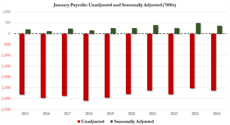 The unemployment rate was steady at 3.7% Avg Hourly Earnings on an annual basis was up to 4.5% an increase from last month by 0.2%. Not exactly the type of inflation Powell wants to see. However Zerohedge posted this Seasonally adjusted chart and its pretty amazing as it shows the January number without the seasonal adjustment is actually down 2.63m jobs: