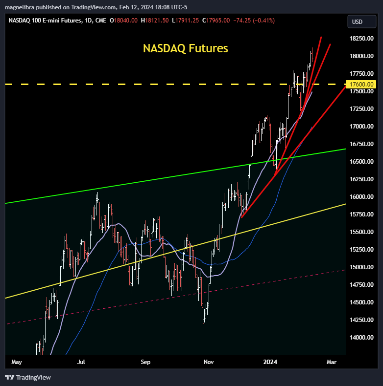 The Nasdaq futures depict an absolute FOMO technical picture. You can see the red base line support lines getting steeper and steeper. Our firs sign of breakdown will come on a daily close below 17850: