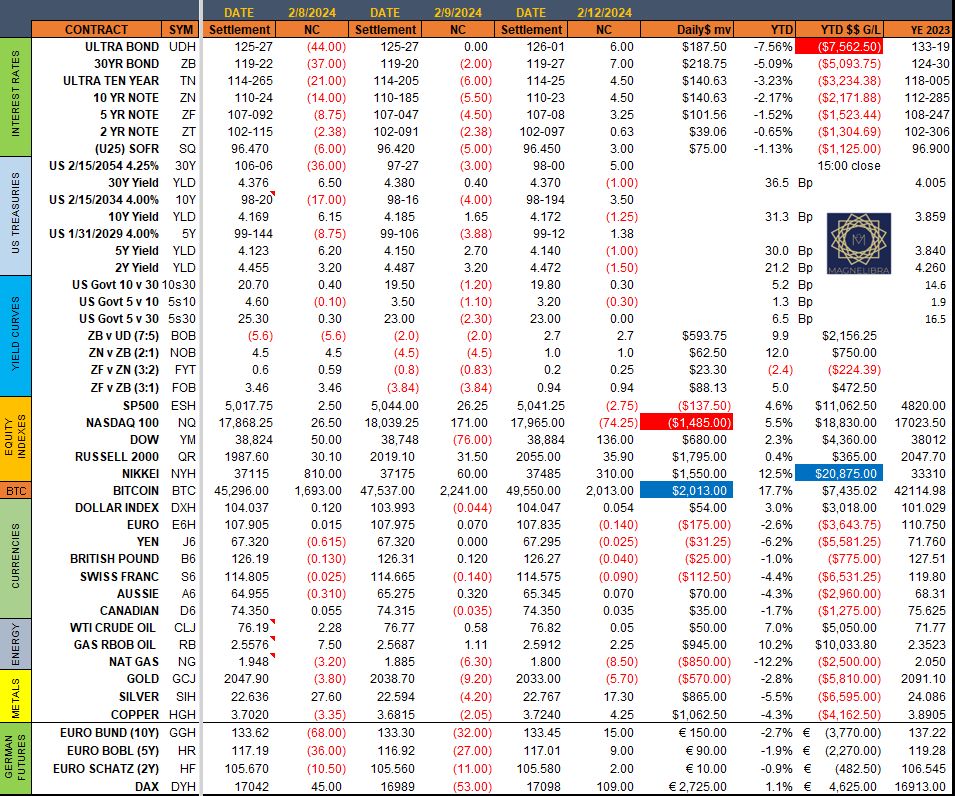 The bond markets the last 2 days have been pretty muted but overall not a good start to 2024. The equities today were led by the R2K and Dow with the Nasdaq a rare weak link. Bitcoin posted another run above $48K briefly trading above $50k and everyone is all bulled up on this here for now, we still believe $43k is a good average proxy here and don’t ever like to chase on these up moves. The next resistance there is $57k which is a major longer term target/reversal area. FX was down slightly and Crude continues to flirt with the $77 area while gold was the weak link in the metals land as Silver and Copper were both higher.
