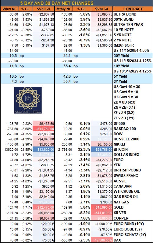 When we take a look at last weeks settlement sheet, it was clearly a profit taking week in equities and nearly every market we cover was lower on the week, with the exception of the US Dollar, Bitcoin and Nat Gas on the heels of anticipation of Russian gas cut offs in the EU: