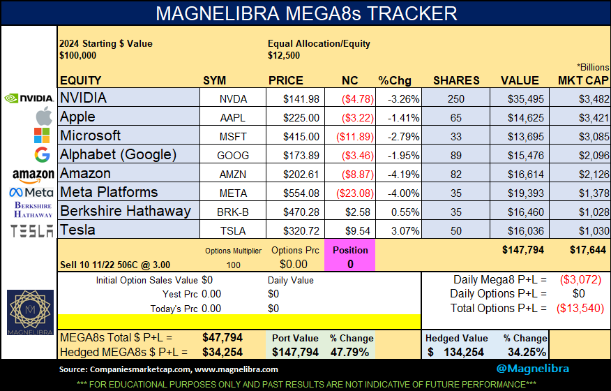 Ok let’s take a look at the MEGA8s, we have updated and cleansed some of our data and here is the update look at the MEGA8s we have been tracking. Berkshire and Tesla the only positives on Friday with META dropping 4% and Amazon -4.2%. The overall market cap is now down almost $500bn or 2.6%, certainly nothing to be alarmed about. This week the hedge potential for this grouping is the 11/22 expiry 506Calls at 3 or better. As of this podcast the high today was 3.15: