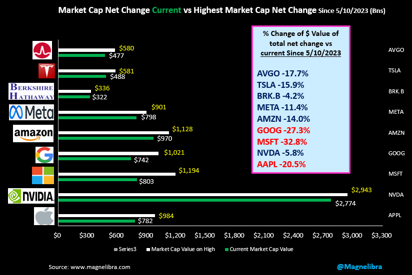 Microsoft is -32.8% (not 36.1%), Google -27.3% and Apple -20.5% in regards to the change in their market cap today versus its highs. These are significant selloffs and a product of both diversification out of these highly concentrated assets but also a product of insider and shareholder monetization. [These values derived from taking the total net change in US dollar value of the market cap from May 10th 2023 and dividing by the highest value net change of market cap in that same time period.]