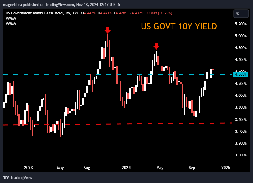 US government bonds continue to push a bit higher in the long end, but the selling in the US bond market seems to have slowed a bit and yields have backed off here so far today as evident by the US Govt 10yr but I won’t get over confident in a yield roll over unless we see 4.36% broken thru to the downside: