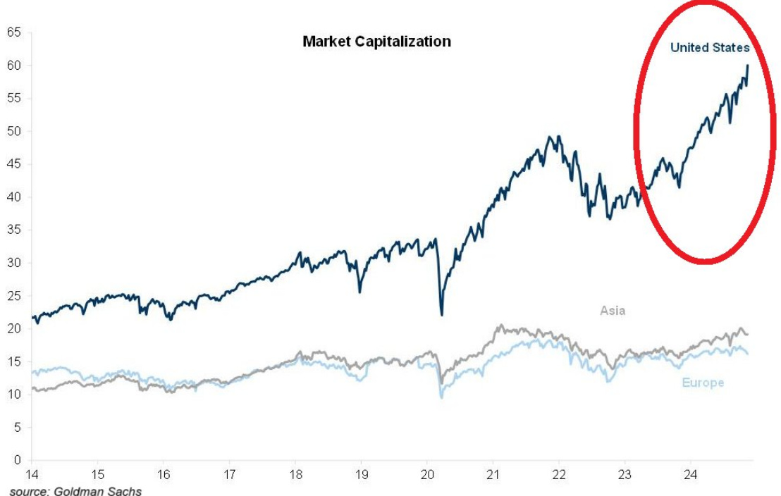 The first thing you will notice is that the majority of upside over the last year has certainly been reflected in the US equity prices and total market cap which is now above $60 Trillion!