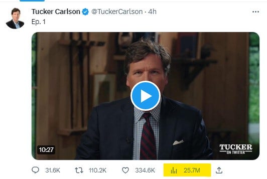 Let’s first step out and say we are certainly glad Tucker Carlson has made his way to Twitter for his first official broadcast which has now been viewed some 25m+ times…To put this into perspective, Tuckers average views on Fox were 3m! He is free to call things out as he sees them and even if you don’t agree, this is a victory for free speech which is so critical in a society that seems to abhor certain rights.