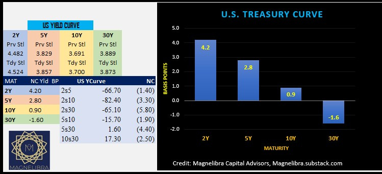Alright let’s take a look at the markets today, starting with the US yield curves which post the 2PM settlement actually saw some decent bids but here are the settles for today with the curve weaker once again:
