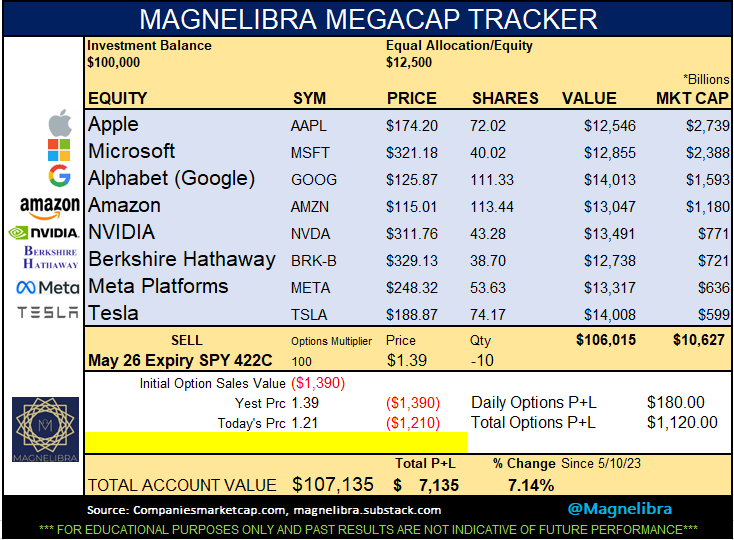 MegaCap Tracker UpdateMike AgneMay 22, 2023∙ PaidShareAlright guys, here is the updated MegaCap Tracker for settlement today 5/22/2023:Just to put how well these trades are doing and to put things into perspective here are each one’s results since we st…Continue reading this post for free, courtesy of Mike Agne.Claim my free postOr purchase a paid subscription.PreviousNext