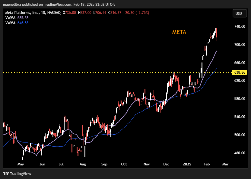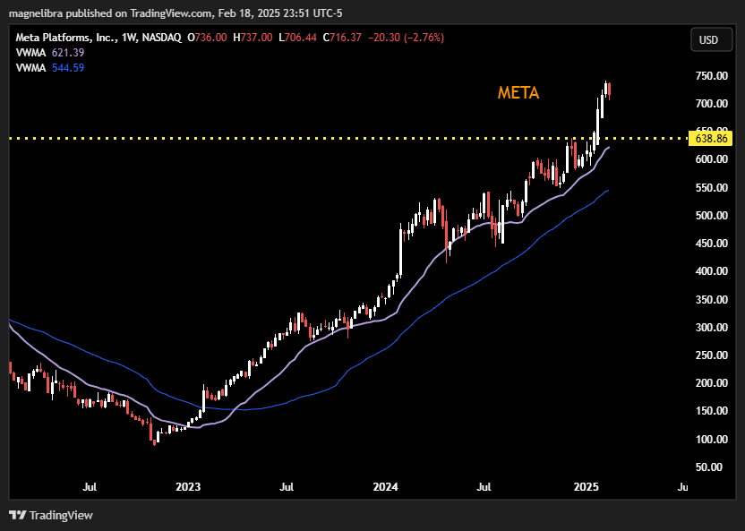 Well after 20 straight trading days higher, META has finally had a losing day! META dropped 2.76% losing $20.30 or giving back what it gained in the prior week. When we look at the weekly chart, today’s selling is just a small bump in the road compared to this epic bull run: