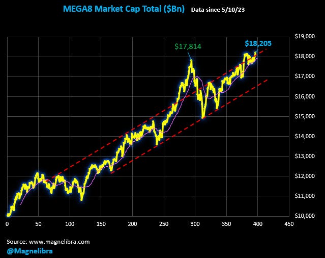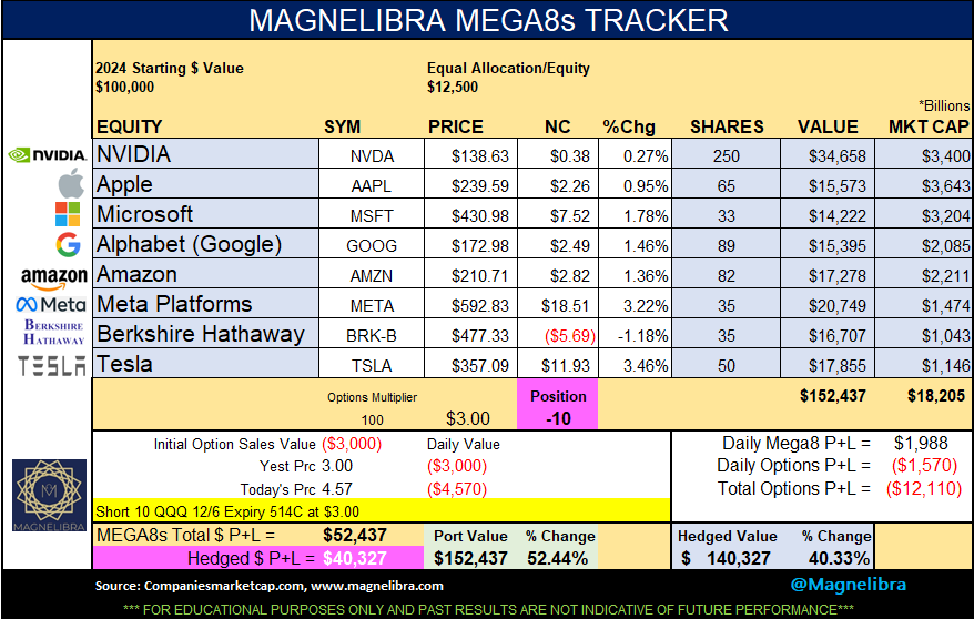 Ok so today’s update is for subscribers only, we will get into MicroStrategy but first lets just start off with yesterdays MEGA8s and Settlement sheets. As far as this week our hedge for this MEGA8 portfolio is the 514 QQQ calls. The MEGA8s hit an all time high once again as its market cap hit $18.2Tn, yea we know Apple should be first on our list, but for now we have kept it Nvidia. None the less Tesla and META were the big winners yesterday up over 3% each. The hedge ate up most of the groupings upside but let’s see how things finish out on the week: