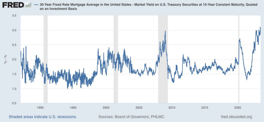 Duration extension. We believe this is the main driver of this spread between mortgage rates and 10 year Treasury yields. The data suggests that 70% of all mortgages are currently below 4%. This means that there is very little incentive for homeowners to refinance their mortgages, what this does is that it extends the duration of mortgage paper, because there is zero incentive to refinance and create new loans. As a result, there is less demand for mortgage-backed securities (MBS), which are the underlying assets that back most mortgages. This lower demand for MBS has pushed down their prices, which has led to higher mortgage rates.