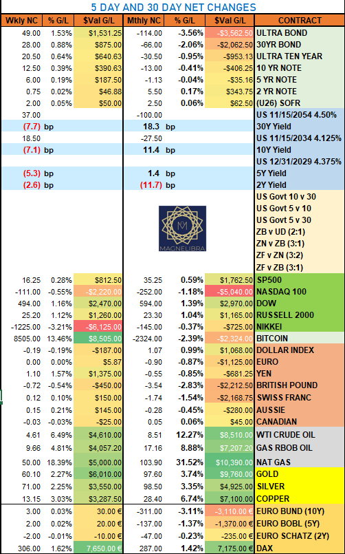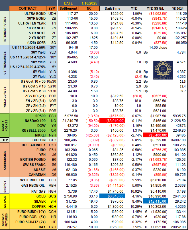 Let’s take a look at today’s settles as the US Bond market had another decent day as the 2Y is back to unchanged on the year, the Nasdaq was the contract value loser on the day with Gold the winner: