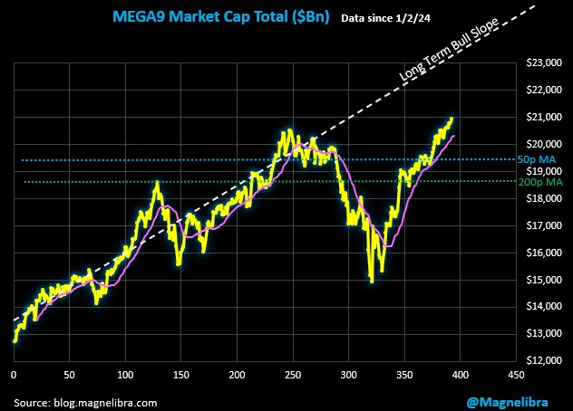 Alright so normally we include the Magnelibra MEGA9 total market cap data in our subscriber section but we want everyone to see this. We want everyone to see just how far 9 stocks can push and push and push and vacuum up a lot of the investment capital out there: