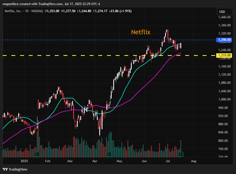 As far as the daily chart for Netflix, on the daily we have 1215 as the bull/bear short term flip with 1290 the key upside break to continue to push higher: