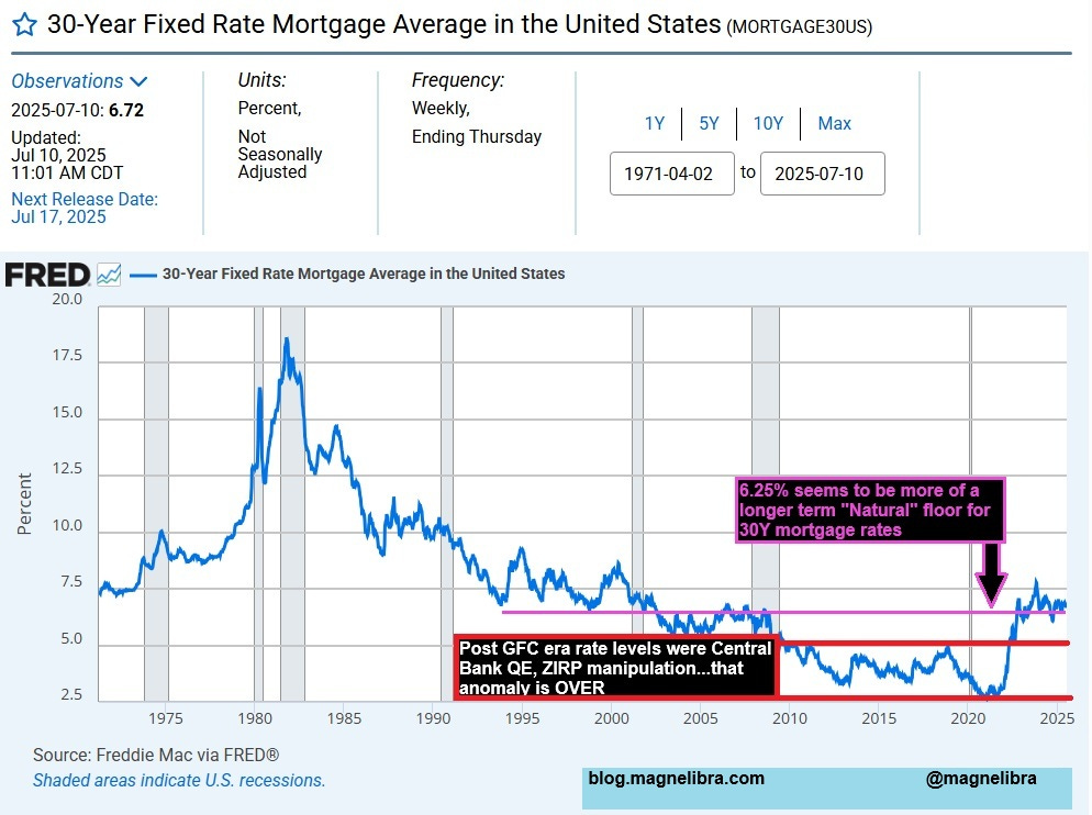 Nobody has seemed to notice, but maybe just maybe 6% plus mortgage rates are the new equilibrium level that everyone will need to retool their spread sheets with. We highly doubt many have calculated for this, but there is a strong possibility that this is indeed the case. Here look at this chart, doesn’t the last decade or so seem like an anomaly? It is merely our perception based upon where we were that we consider rates “high”. Talk to somebody in 1981 and ask them if paying a 6.5% 30Y fixed rate mortgage seems reasonable, you get the point: