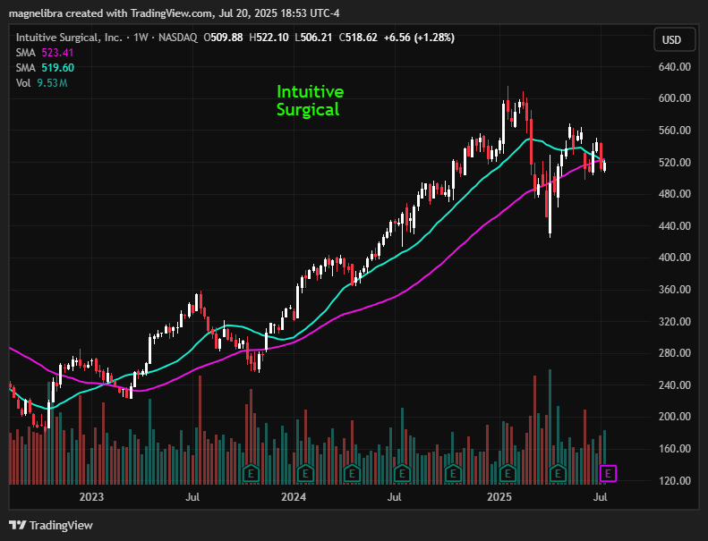 This week our early focus is on Intuitive Surgical, the moving average cross here is what’s leading us toward put structures for the earnings. The options straddles are looking for a 6.7% move or 35 points. We are targeting the 7/25 expiry $510/$480 put spread which can be bought for 9.25, so risking 9.25 to make 20.75 for a 2.24x risk reward structure. Take a look at the chart, we know this stock is a retail and institutional favorite but technically, it seems set up for a down move: