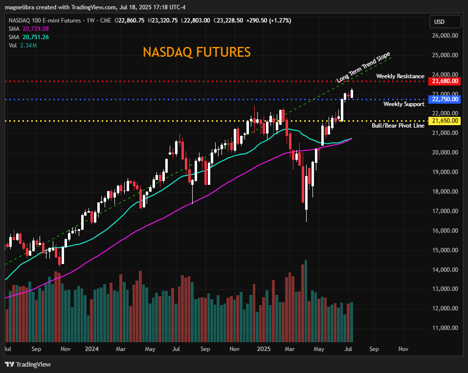 As far as the futures indexes, the Nasdaq futures, our first floor to watch this week is 22,750 and on the upside we should see resistance up at 23,680: