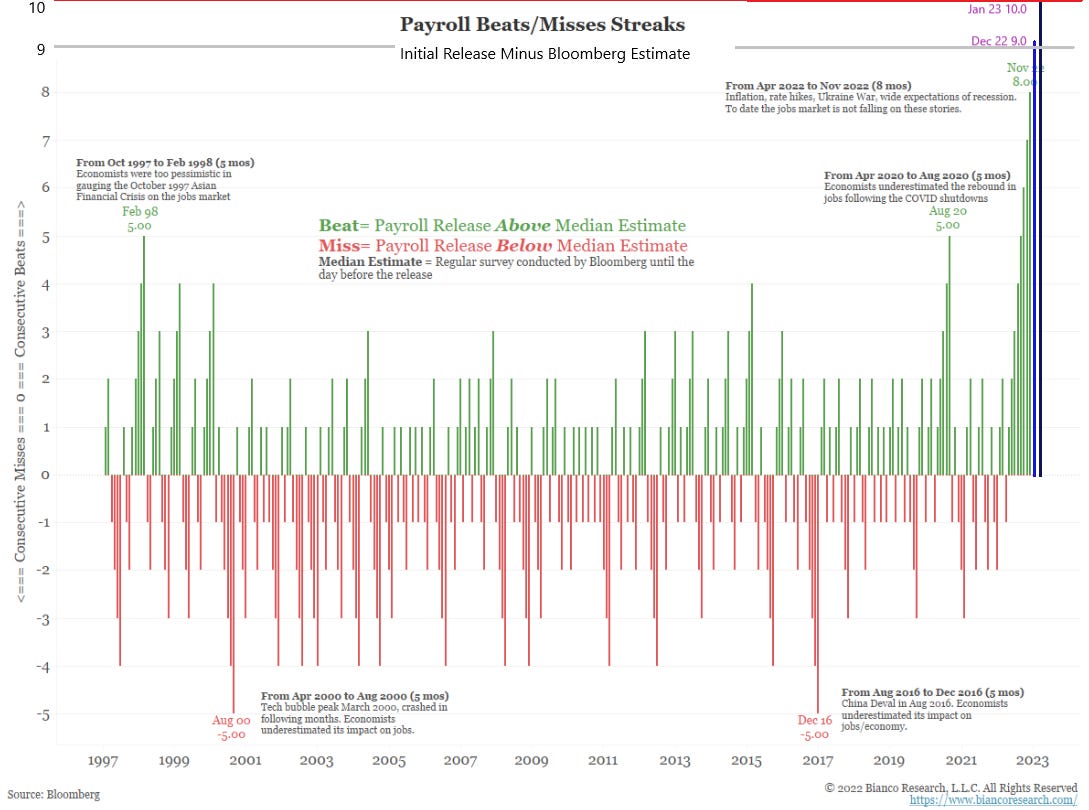 Just like the FOMC and their targeting of inflation “expectations” its managing expectations that is more important than the actual inflation numbers themselves. Managing these outlier numbers like the consistent beat by NFP over the last 10 months is akin to managing the expectations our administration is trying to paint, which is that our economy is rolling along just fine and that a recession is not certain…they manage this expectation by posting numbers like this NFP. Just to show you how rare these beats are, we have included the last 2 months (In Blue) to Jim Bianco’s recent chart: