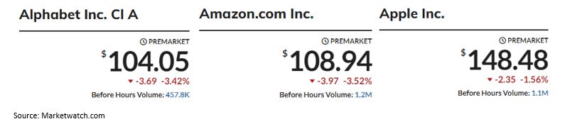We put out a piece last night noting the weakness in the tech sector (Amazon, Alphabet and Apple) earnings brigade out after the bell. This morning is seeing a bounce off overnight lows, but all are still significantly negative on the day:
