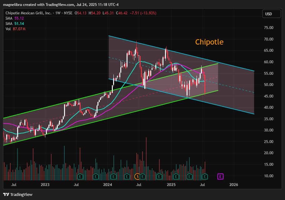 We also wanted to take a quick look at Chipotle (CMG) where declining margins and flat comparable sales are hitting the stock. We also noted awhile back that the departure of Brian Niccol was going to be a problem for CMG which basically marked the all time high in the stock in mid 2024. For now we suspect buyers will step up here at the $46 level but $40 to $55 seems to be the longer term range trade now for this: