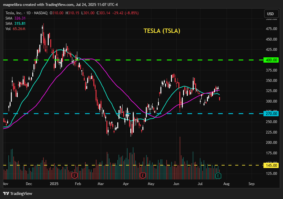 Ok we also had Tesla and Alphabet earnings so lets hop over there. Tesla missed both revenues and EPS posting a 12% decline YoY on $22.5bn revenue and EPS came in at $0.40 vs $0.42 exp. As far as the chart Tesla is down nearly 9% back down to $303: