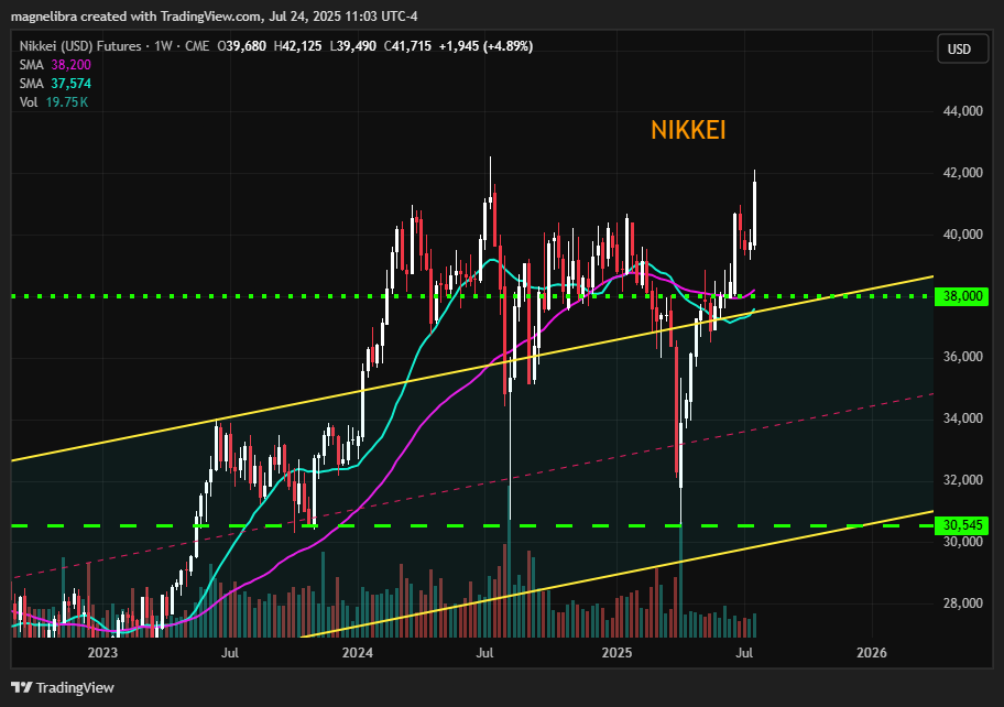 Ok first up let’s take a look at the Nikkei which jumped over 4% on news that Washington and Tokyo have finalized a $550Bn trade deal. Toyota certainly welcomed a 15% tariff agreement as its American competition is still paying high input costs due to ongoing tariff issues. However, despite being up nearly 5% on the week, the Nikkei is barely up YoY and this area is the same area it sold off from the previous time we were up here. That is the reflexive cautious theme, the other theme is that we are possibly breaking out of a year and a half long basing patter. So we can see the case for both caution and optimism: