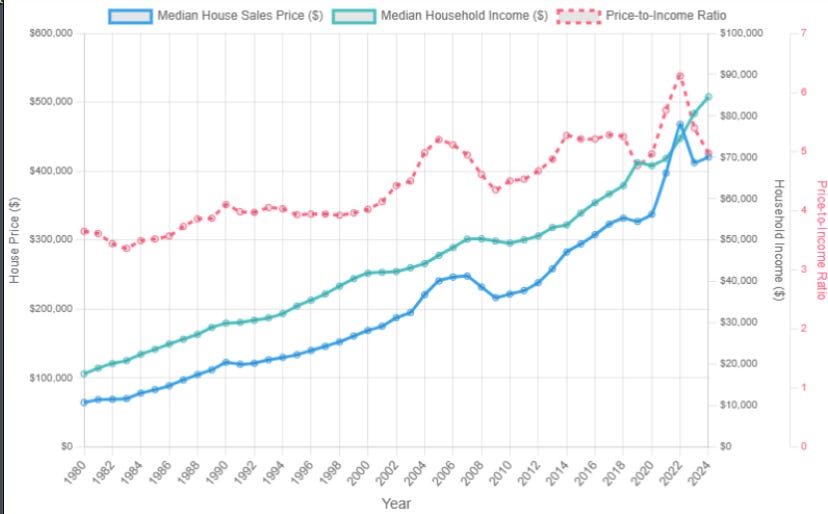 Speaking of affordability, we created this chart plotting median home sales price and median household income. The ratio currently sits near a 5x, historically its more near 4x so we are still some 20% away from a fair value. We like looking at things thru this lens because it takes into consideration rates, prices, incomes, etc. and focuses purely on a longer term ratio that we can target: