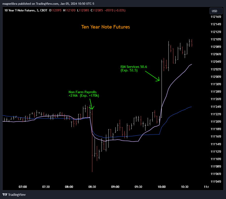 Ok so let’s take a look at some of the markets reaction off of these numbers. First let’s look at the Ten Year Futures. We can see the NFP downdraft dropping tens down half a point until the algo’s dug under the hood of the data then the market stabilized. Then the ISM number came out posting a 50.6 nearly 2 points lower then expected and the market rallied over half a point and has continued to press the highs all morning: