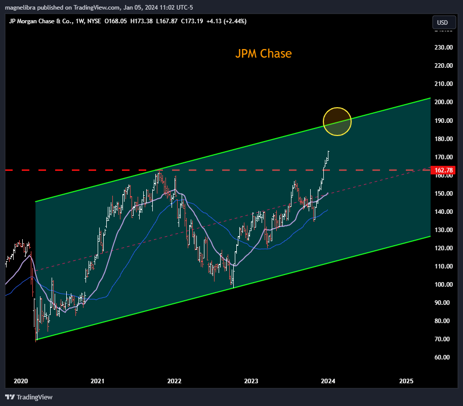 Considering JPM continues to grow let’s take a look at their stock we like this channel it is riding in and we suspect that an attack on the $190/$195 area before seeing sellers: