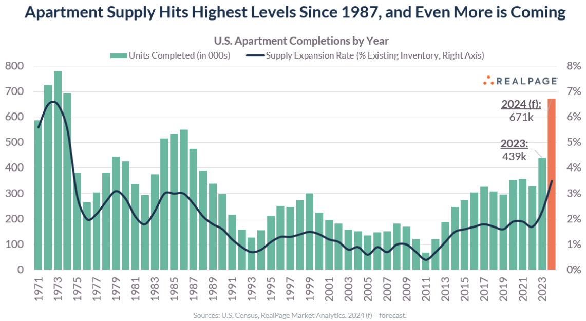 One good thing we see is that prices are not accelerating and we suspect that if rates do fall that prices will collapse due to the overwhelming supply of homes that will be dumped onto the markets. Not to mention the recent data is showing a massive amount of new supply coming to market now in the apartment sector, so this is indeed good news for consumers. This chart shows that we are hitting multi decade supply expansion rates: