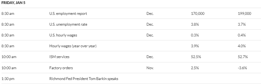 Here is the calendar of data for tomorrow and obviously employment report is the highlight of the day where the expectation is for a rise of 170k jobs. We are going with the under on this one and suspect the bond market will rally if it does indeed come in below this number and equities may rally as well given they might be in the camp of bad news is good news due to the rate cut scenarios: