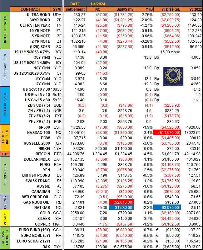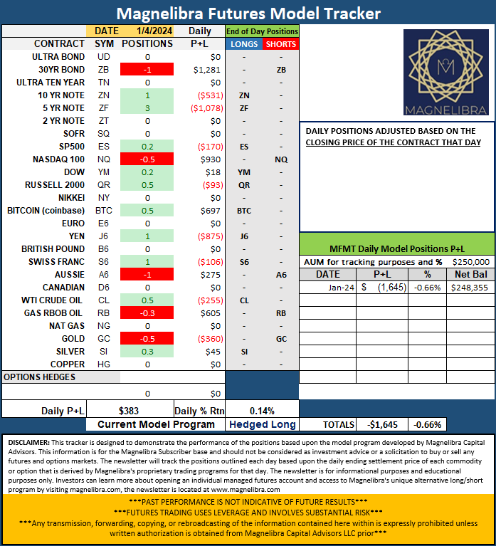 As far as our Magnelibra Futures Model Tracker, no changes across the board here: