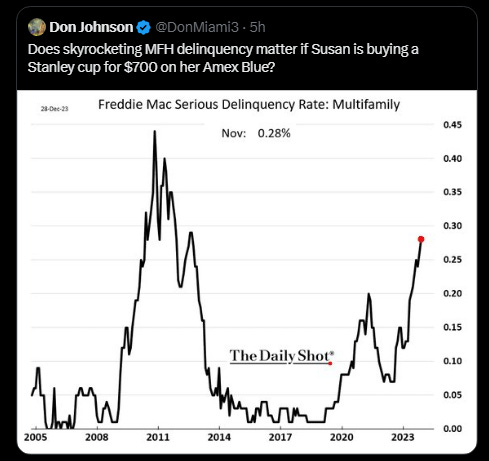 Our final data point and sticking with the housing theme is that Freddie Mac delinquency rates on multifamily are now at levels not seen since 2013, @DonMiami3 shared this chart on X: