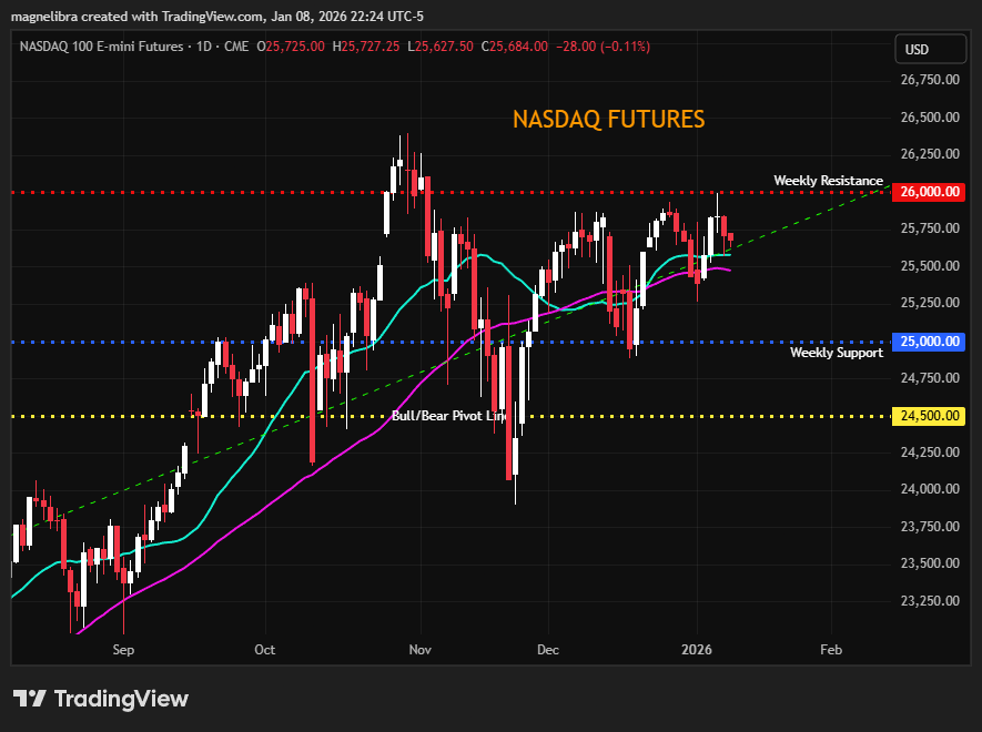 Here is the Nasdaq futures chart where the daily shows our resistance level this week put a decent top in and tomorrows close will be very important. A move above 26k and the bulls are back in charge, a fail here and move below 25k will bring in systematic and fast money sellers looking for levered longs to puke: