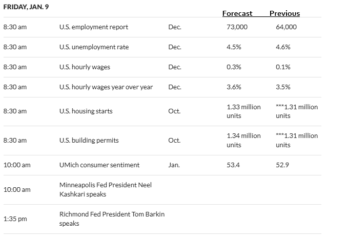 Well guys, we have the first big US jobs data of the year tomorrow. The street is expecting a relatively soft print, with plenty of caution about potential volatility in markets like stocks, crypto, gold, and the dollar. Consensus expectations are coming in around +60,000 to +70,000 jobs added.. The unemployment rate is expected around 4.5% (slight dip from recent levels), with wage growth watched closely for inflation signals. Many long time readers know that a series of negative prints will usher in a panic mode for the FOMC to cut rates faster and usher in the next major down leg in bond yields.