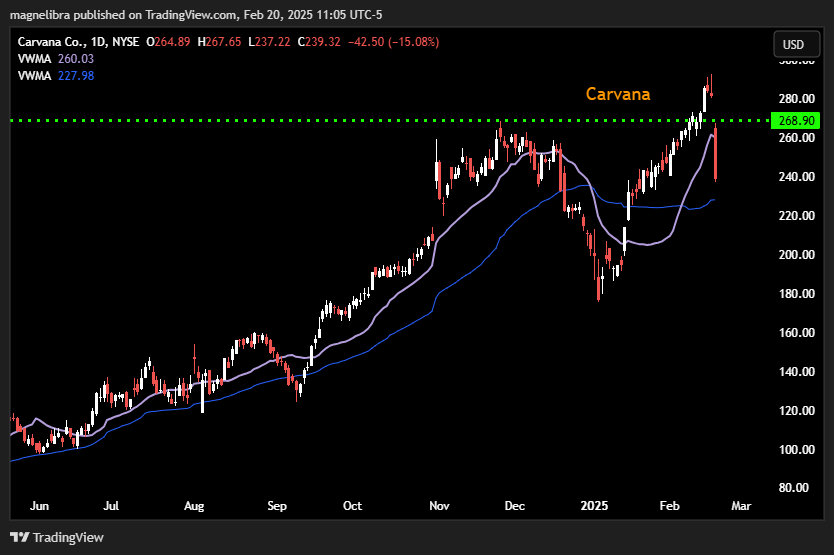 Looking back at yesterday’s free post we touched upon Carvana and a potential for earnings to see selling after wards. We highlighted the $260/240 put spread for about a 4.4x risk/reward payoff. Well Carvana today is -15% trading $239, -$42.50: