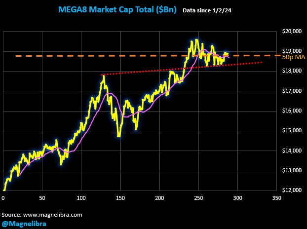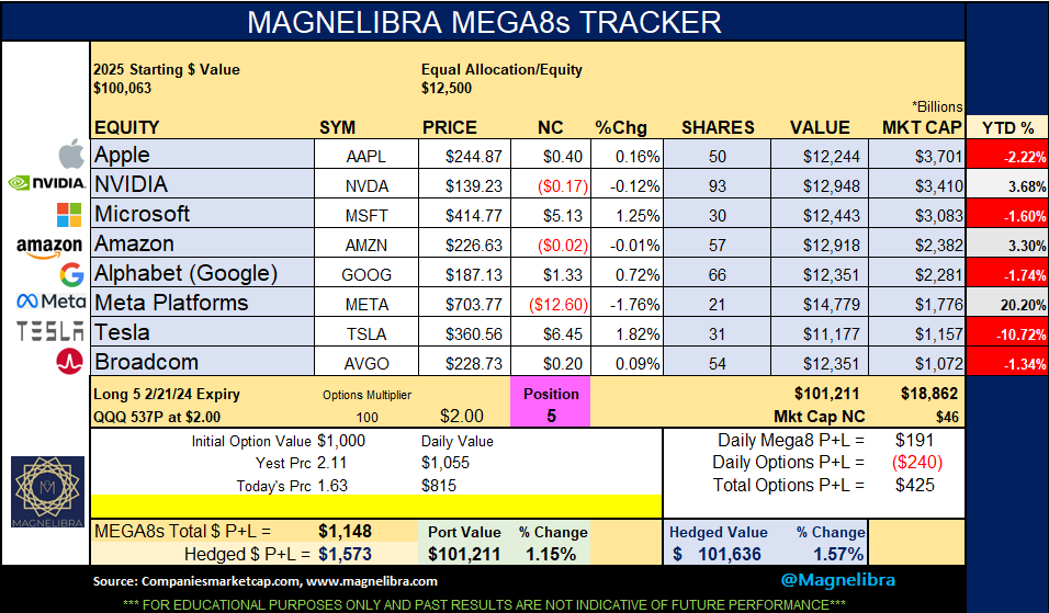 As far as the MEGA8s Tracker, the hedge for this week is the outright put in the QQQs as opposed to a short call. We continue to see the group struggle on the year as a whole. This tells us there is a lot of instuitional selling and or rotation out of this grouping. The systematic selling can be hidden on a daily basis, but cumulatively we can deconstruct it via the performance. Honestly this group sans META has been lackluster for sure: