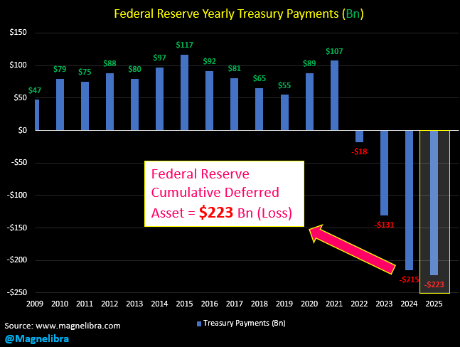 This is the kind of thing that destroys a banks ability to function, it destroys their capital ratios and its why higher rates are truly leverage killers. These average banks can’t do what the Federal Reserve and Central Banks can do, which is simply create “Deferred Assets.” Deferred Assets is a fancy accounting term for “Losses.” See the chart here, this is the Federal Reserves current unrealized losses $223 Billion: