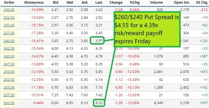 The Put Spreads we highlighted yesterday shown here in our post which was valued at $4.55 yesterday is trading $16.20 today, so congrats if you played that yesterday, a settle below $240 by Friday would realize the full value of the spread or $20: