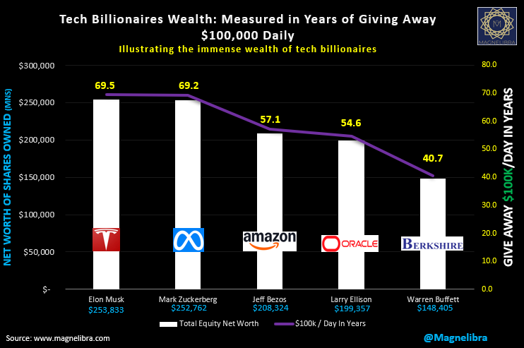 The wealth is so massively concentrated to the very few, its at absurd levels. We have shown this chart before, but we are going to post it again. What it displays is the top 5 tech billionaires and shows just how many days in a row 1% of their wealth could afford to give away $100,000. The Musk and the Zuck are battling it out for the top spot, a massive 69 years plus in a row:
