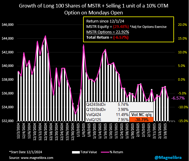 As far as StrategyB (MicroStrategy formerly, symbol MSTR), well the stock was pounded yesterday losing 4.56% on the day. The call selling strategy continues to weaken as Vol QoQ is down 31%: