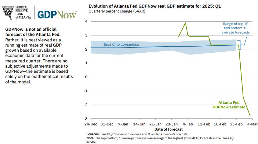 Ok so as far as the big news, well there really isn’t much, and no we don’t care really about the Oval office incident with VZelensky, we don’t. What we do care more about though is the Atlanta FED GDP forecast which has done a massive about face going from +2.33% to its current -2.825%! What is the ATL FED seeing exactly? We know this is a mathematical model and mostly due to tariffs and the trade deficit but this is pretty significant: