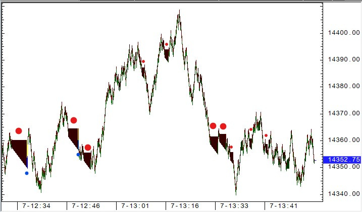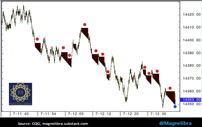 As we noted in our prior updates, we spotted a key passive algo starting on Monday mid day with a consistent sell into any and all bids that tried to rally the Nasdaq futures. This seller has continued and probably brought in a few of their buddies. Here is the same Algo selling program running into some very large bidders at 14350. The blue dots represent 1000 lots (total bid/ask traded) for the given bar: