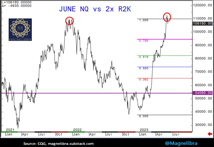 Alright so a couple of quick notes here, the June Nasdaq vs 2xRTY chart seems to be faltering at a very key level here. Now we know the big outfits take time to change their flows, but even they can’t hide it when it comes to actual positions affecting pricing. This area seems ripe for a few big names to start unloading on the crowded Tech vs all trade and we are seeing it uniformly today where by the R2k Small Cap index is +2.3% while the Nasdaq is -0.15% on the day. Here is the chart: